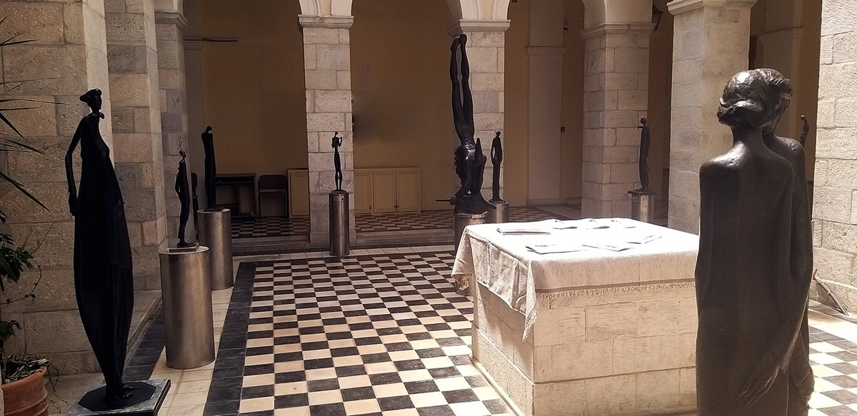 Η έκθεση περιλαμβάνει επιλεγμένα έργα που αποτυπώνουν κομβικές στιγμές από την πολύχρονη διαδρομή του καλλιτέχνη, εστιάζοντας στην ένταση της μορφής, τον στοχασμό του μετάλλου και τη γλυπτική ως φορέα μνήμης και μεταφυσικής αναζήτησης. Η εικαστική γλώσσα του Καλογηράτου, λιτή αλλά φορτισμένη, συνδιαλέγεται με τον χώρο του Αιθρίου, μετατρέποντάς τον σε σημείο σιωπηλού διαλογισμού και μορφολογικής εμπειρίας.