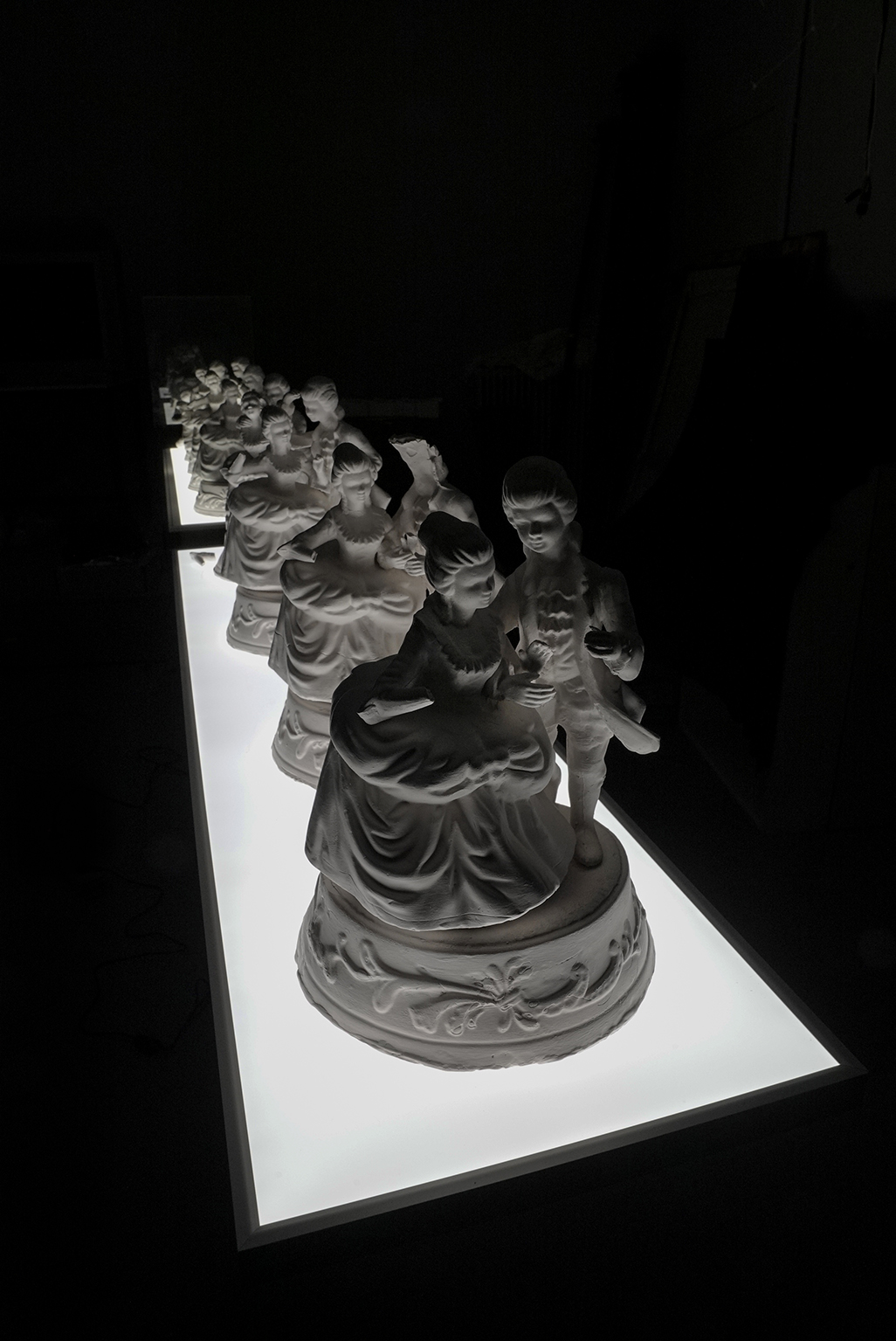 Εκκινώντας από το μνημονικό φορτίο που εκλύεται επ’ αφορμή ενός βιωμένου, κοινότυπου οικογενειακού μπιμπελό, συμβολικού απεικάσματος της ρόδινης εικόνας ενός νεαρού ζευγαριού –μία στερεότυπη, προαστική, ηθογραφική τυπολογία – η Β. Μπέτσου, Επίκουρη Καθηγήτρια στο Τμήμα Εικαστικών Τεχνών της ΑΣΚΤ, αφηγείται μια ιστορία παρακμής και κατάρρευσης της αστικής οικογένειας. Επιλέγει ένα θέμα πλήρες σε εικονολογικές συμβάσεις και συμβολισμούς, για να αναδείξει τις ενεχόμενες σε αυτό πολιτικές και ψυχολογικές προεκτάσεις στο επίπεδο της πραγματικής ζωής των ανθρώπων, την ίδια την πραγματικότητα ως ένα τραυματικό ατύχημα.