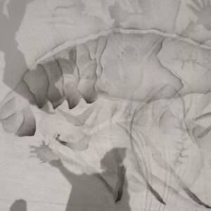 Η έκθεση αποτελείται από μια ενότητα έργων όπου η ανθρώπινη και ζωική μορφή, καθώς και μυθολογικά μοτίβα, επανεμφανίζονται ως μορφές μνήμης και εμπειρίας. Στον πυρήνα της εικαστικής διαδικασίας βρίσκεται το σχέδιο και η μονοχρωμία, ως θεμελιώδης αρχή του έργου, η οποία ανασυντίθεται και επανενεργοποιείται μέσα από αλλεπάλληλες διαφάνειες και στρώσεις υλικού. Στα έργα, μορφές ανθρώπων, ζώων και μυθικών συμβόλων δεν εμφανίζονται ως αφηγήσεις ή σκηνές, αλλά ως ίχνη που μοιάζουν να έχουν περάσει από τον χρόνο. Η εικόνα δεν προσφέρεται ως στιγμιαία εντύπωση· ζητά από τον θεατή να σταθεί και να συνυπάρξει μαζί της.