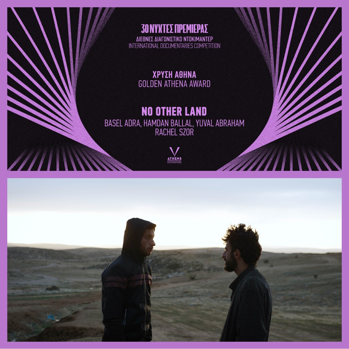 - Χρυσή Αθηνά Καλύτερου Ντοκιμαντέρ: Καμία ‘Αλλη Γη (Μπάζελ ‘Αντρα, Χαμντάν Μπαλάλ, Γιουβάλ Αμπραχάμ, Ρέιτσελ Ζορ)