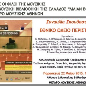 Αυτή την Παρασκευή 22 Μαΐου 2015 η Μουσική Βιβλιοθήκη φιλοξενεί για πρώτη φορά το Εθνικό Ωδείο Περιστερίου.
