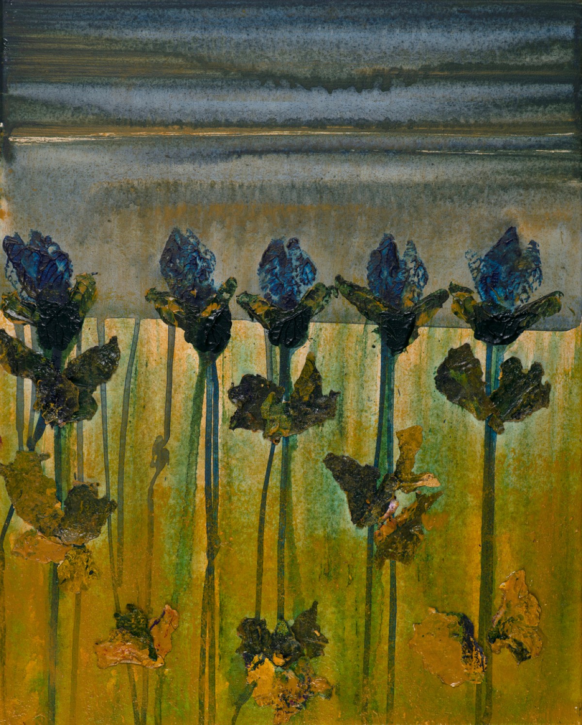 Η ζωγράφος, με τον παιγνιώδη και ευφάνταστο τίτλο που επιλέγει για τη συλλογή της – Περπατώ, περπατώ εις τον κήπο, όταν εκείνος δεν είναι εδώ – κλείνει το μάτι στον επισκέπτη και περιηγείται μαζί του μέσα σε κήπους που δεν υπάρχουν, κι όμως, είναι ολοκληρωτικά εδώ. Και είναι εδώ κατά τρόπο πολύσημο, αποτελούν τις πολλαπλές εκδοχές του ίδιου ερεθίσματος, όπως αυτό ερμηνεύεται από κάθε θεατή, από κάθε βλέμμα που μπορεί να ανοίγει κατά τον ίδιο πάντα τρόπο μπροστά στη θέα και τη θέαση του έργου, προσλαμβάνει όμως τη δική του απόχρωση, τη δική του θερμοκρασία, τη δική του ένταση. Τον δικό του, εν τέλει, βηματισμό μέσα στον χρόνο της σύνθεσης.