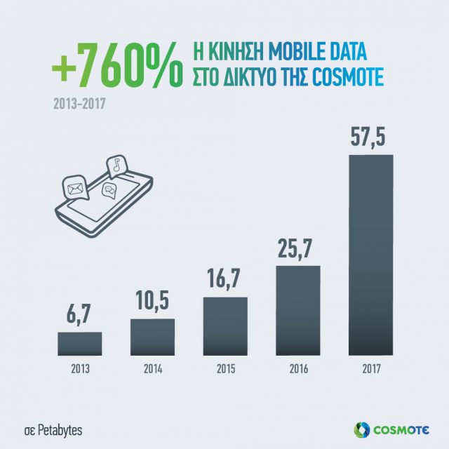 Αξίζει να επαναλάβουμε πως παρόλο που την τελευταία πενταετία, η κίνηση mobile data μέσω του δικτύου της Cosmote έχει σημειώσει θεαματική άνοδο, που φτάνει το 760%, ωστόσο το ίδιο διάστημα, η μέση χρέωση ανά GB έχει μειωθεί σχεδόν 75%. Επιπλέον, μόνο το 2017, καταναλώθηκαν πάνω από 57,5 petabytes (1 petabyte=1000 terabytes ), ενώ το 2018 η χρήση των data αναμένεται να αυξηθεί πάνω από 50%!