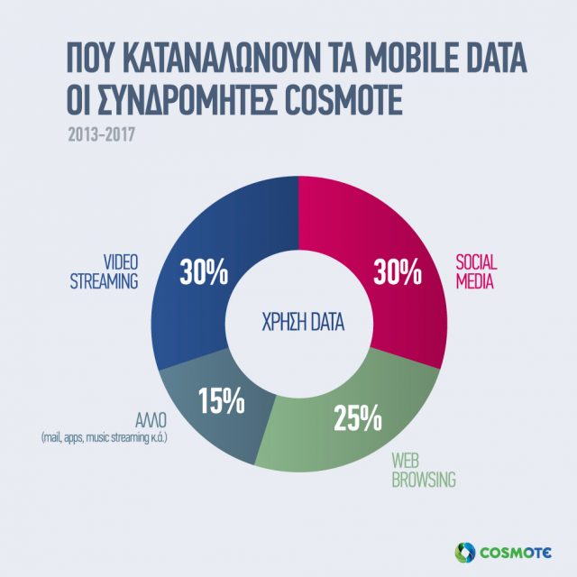 Μάλιστα, όλα τα παραπάνω αποδεικνύουν και τα επίσημα στοιχεία της Cosmote καθώς υπογραμμίζουν πως η κίνηση mobile data στο δίκτυο της αυξήθηκε κατά 760%, το διάστημα 2013-2017! Και πού καταναλώνουμε αυτά τα mobile data; Το 30% αυτών, όπως είναι αναμενόμενο, καταναλώνεται στα social media, το άλλο 30% σε video streaming, το 25% σε web browsing και το 15% σε όλες τις άλλες εργασίες που κάνουμε από το smartphone μας.