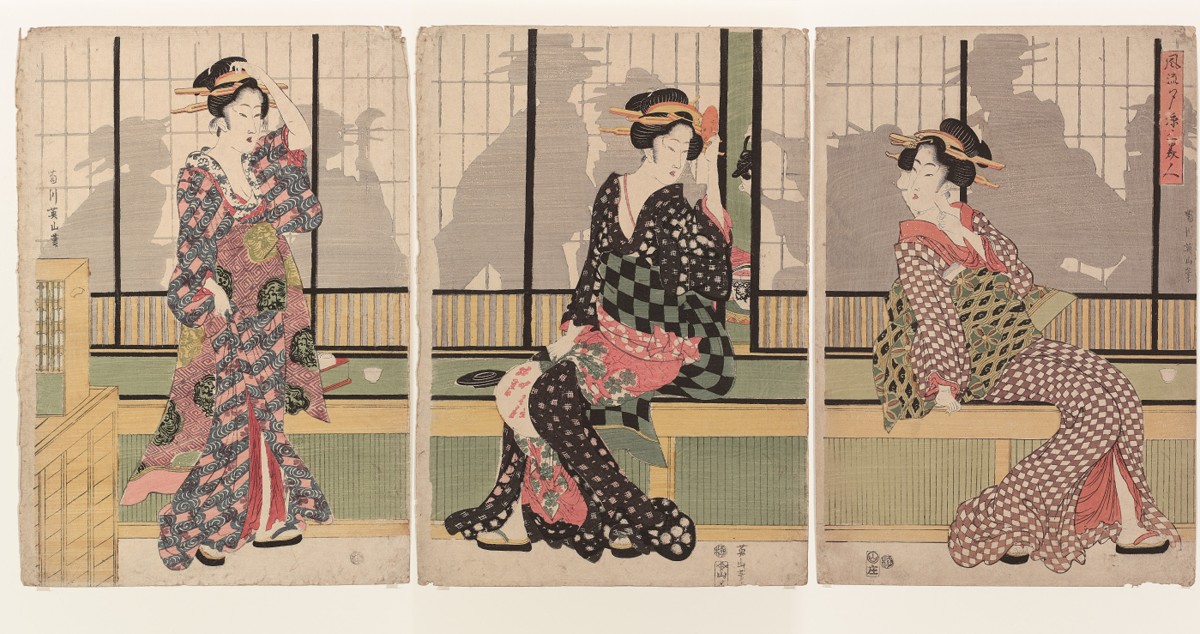 Δώδεκα έγχρωμες ξυλογραφίες του περίφημου καλλιτέχνη Kitagawa Utamaro, από τη σειρά «Η ενασχόληση των γυναικών με τη σηροτροφία», απεικονίζουν τα στάδια μιας παραγωγικής διαδικασίας που παραδοσιακά ανήκε στις γυναικείες εργασίες και αποτελούσε έναν από τους σημαντικότερους κλάδους της οικονομίας του Edo (σημερινό Τόκιο).