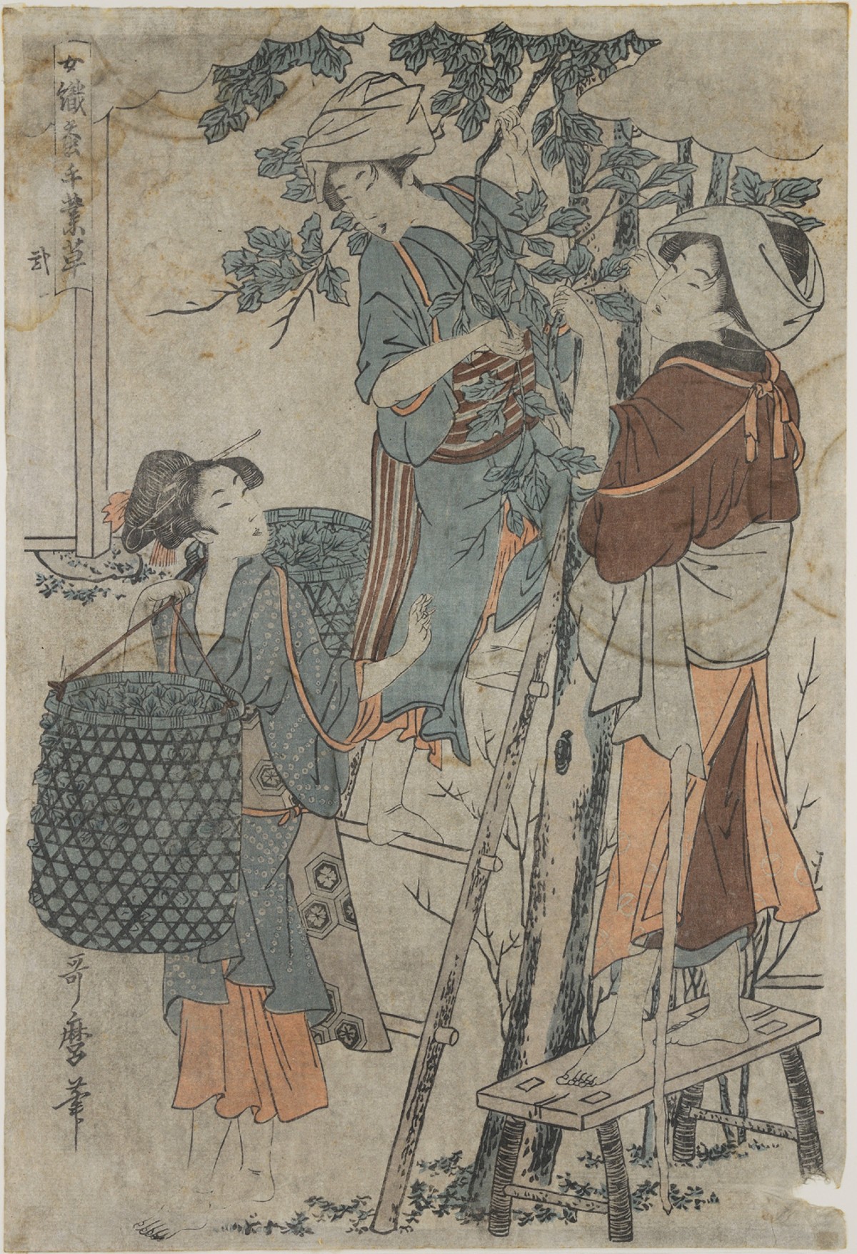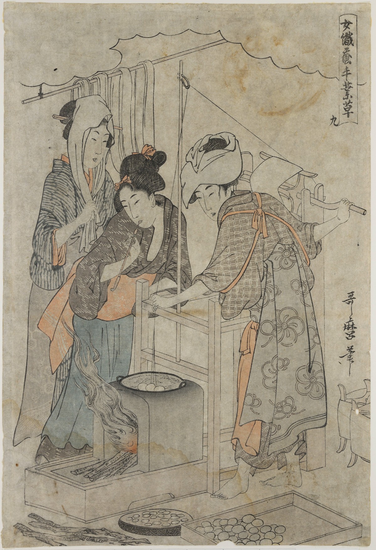 Δώδεκα έγχρωμες ξυλογραφίες του περίφημου καλλιτέχνη Kitagawa Utamaro, από τη σειρά «Η ενασχόληση των γυναικών με τη σηροτροφία», απεικονίζουν τα στάδια μιας παραγωγικής διαδικασίας που παραδοσιακά ανήκε στις γυναικείες εργασίες και αποτελούσε έναν από τους σημαντικότερους κλάδους της οικονομίας του Edo (σημερινό Τόκιο).