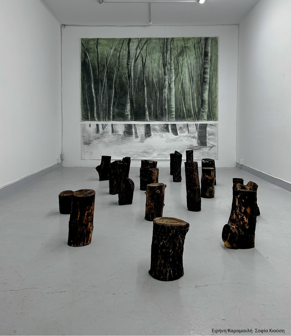 Το κοινό τους έργο με τίτλο “Πράσινες Στάχτες”, εγκατάσταση που αποτελείται από φυσικά υλικά και μεγάλης κλίμακας ζωγραφικά έργα , αναφέρεται στο φαινόμενο των πυρκαγιών που εκδηλώνονται τα τελευταία καλοκαίρια στην Ελλάδα. Ως κάτοικοι περιοχών κοντά σε δασικές εκτάσεις, βιώνοντας την ανησυχία και τον φόβο που προκαλεί αυτό το επαναλαμβανόμενο φαινόμενο, δημιουργήθηκε μέσα από την κοινή τους συνεργασία ένα έργο που αναδεικνύει δύο διαφορετικές όψεις της εμπειρίας των συχνών πυρκαγιών. Από τη μία, υπάρχει ο προσωπικός φόβος και η ανησυχία που βιώνουν ως κάτοικοι περιοχών με παρόμοιους κινδύνους, από την άλλη, υπάρχει η έννοια της παρατήρησης αυτών των φαινομένων από την απόσταση του απλού παρατηρητή . Ο σκοπός δεν είναι να σχολιαστουν οι λόγοι και οι αιτίες πίσω από αυτά τα γεγονότα. Αντίθετα, μέσα από τις δύο διαφορετικές σκοπιές, το έργο “Πράσινες Στάχτες” αποτυπώνει την αντίληψή τους τόσο για το ίδιο το φαινόμενο, όσο και για την επαναλαμβανόμενη φύση της ιστορίας του. Ο lary Soundplanner Guitar, synthesizer, field recordings, electronics ,θα παρουσιάσει ένα μουσικό έργο που κινείται στον χώρο της Ambient, experimental και minimal με χρήση field recordings που προέκυψε κατόπιν της γνωριμίας με τις καλλιτέχνιδες, της συζήτησης και της παρατήρησης των έργων τους.