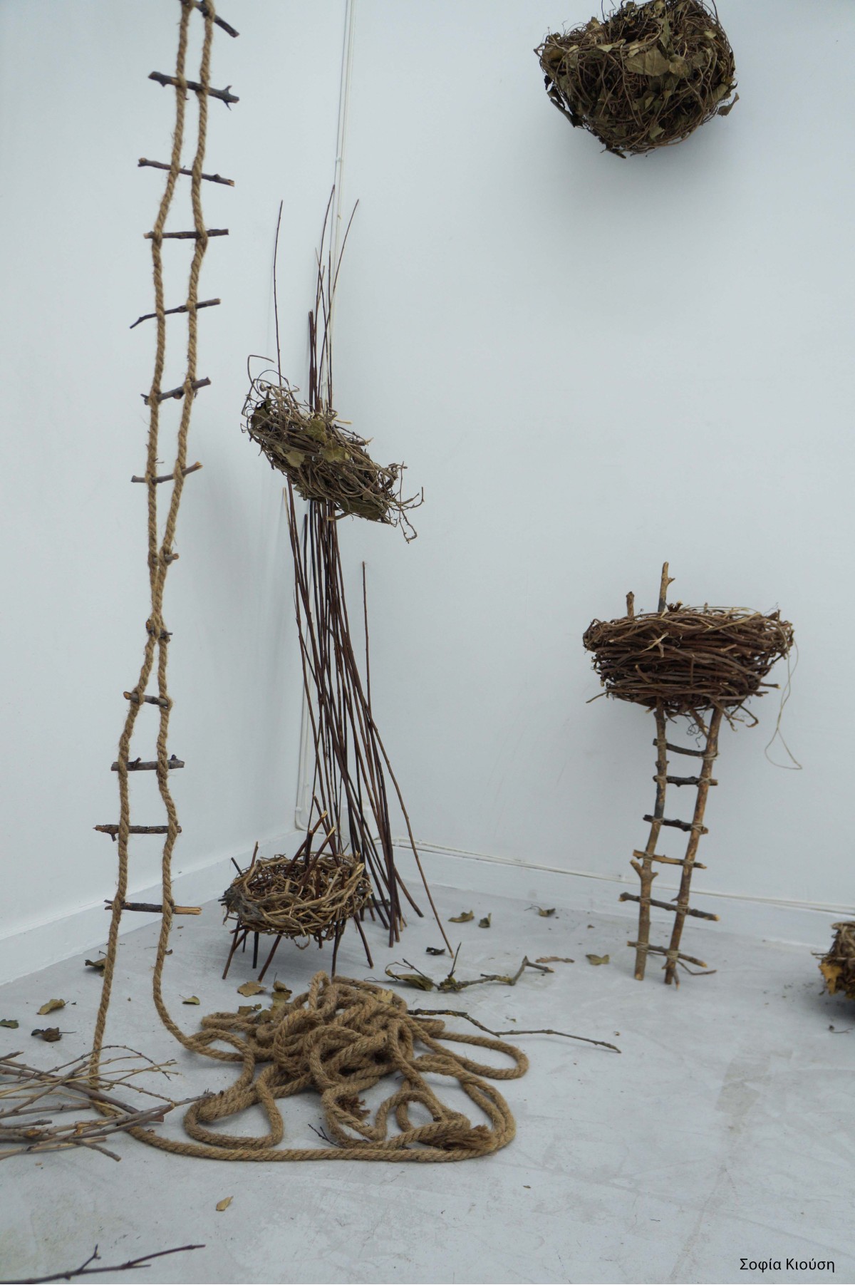 H Σοφίας Κιούση δημιουργεί ένα περιβάλλον εγκατάσταση από κατασκευές (φωλιές) με φυσικά υλικά (κλαδιά, σχοινιά, μαλλί) με τον τίτλο “Όπου Υπάρχω”. Το έργο προκύπτει από την παρατήρηση της κατάστασης όπου το άτομο συνειδητοποιεί ότι ένα περιβάλλον δεν του ταιριάζει, ειδικά όταν πρόκειται για τον τόπο που θεωρεί σπίτι του. Η ανάγκη για ένα νέο ξεκίνημα προς έναν χώρο που μπορεί να θεωρηθεί δικός του με κάθε έννοια, αναδύεται. Σε αυτό το σημείο γίνεται εμφανής ο συσχετισμός της ανθρώπινης συμπεριφοράς με αυτής των πουλιών, ειδικά σε ότι αφορά την αίσθηση ελευθερίας που επιθυμούμε να νιώθουμε όπως αυτά. Συγκεκριμένα, τα πουλιά δεν είναι δεμένα με το φώλιασμα τους όπως οι άνθρωποι είναι συναισθηματικά δεμένοι με τα σπίτια τους, είτε λόγω των ανθρώπων που συμβιώνουν είτε λόγω της φύσης της κατοικίας της ίδιας ,ενω εύκολα κατασκευάζουν και εξίσου εύκολα εγκαταλείπουν τα φωλιά τους όταν οι συνθήκες το απαιτούν.