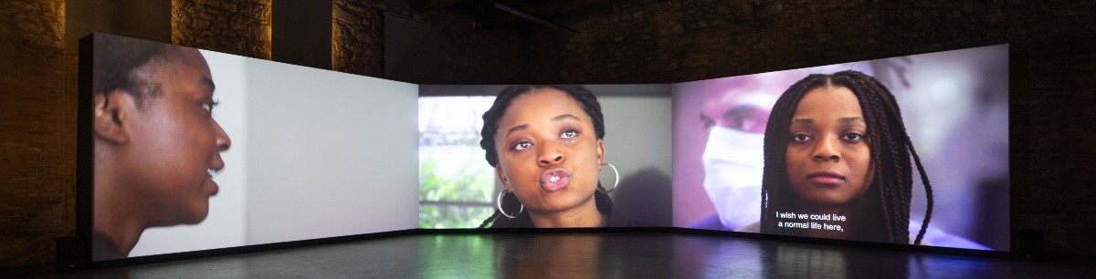 Στο διάδρομο, οι πλεκτές εγκαταστάσεις της κύπριας Μαρίας Λοϊζίδου μάς παραπέμπουν σε συλλογικές και προσωπικές ιστορίες διασποράς. Δεξιά και αριστερά, στις δύο αίθουσες, αναπτύσσεται το σε εξέλιξη συλλογικό κοινοτικό έργο της ομάδας Døcumatism με θέμα τους AfroGreeks για την αφρικανική διασπορά στην Ελλάδα.