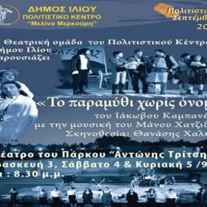 Στα πλαίσια του φεστιβάλ του Δήμου Ιλίου, «Πολιτιστικός Σεπτέμβρης 2010», το Πολιτιστικό Κέντρο του...