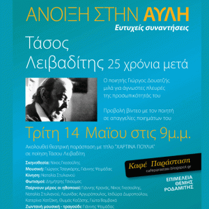 Ανοιξη στην αυλή – Ευτυχείς συναντήσεις: Τάσος Λειβαδίτης-25 χρόνια μετά, αφιέρωμα στο θέατρο Χυτήριο