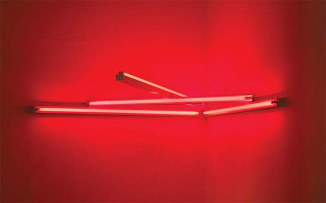 2. Dan Flavi, monument 4 for those who have been killed in ambush (to P. K. who reminded me about death), 1966 red fluorescent light, 244 x 244 cm, CL no. 109. ©Stephen Flavin/Artists Rights Society (ARS), New York/OSDEETE, Athens 2015; courtesy David Zwirner, New York/London Photo by Stefan Altenburger.