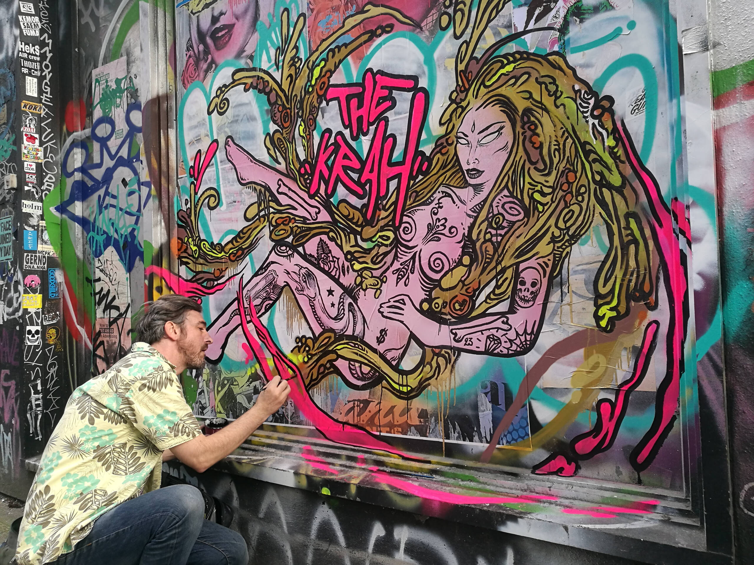 Ο The Krah επηρεασμένος από την art nouveau, τον pop-σουρεαλισμό και την urban art που εκπροσωπεί, θα παρουσιάσει ζωγραφικά έργα, γλυπτά και graffiti murals με θέμα την μυθολογία στη σύγχρονη εποχή.