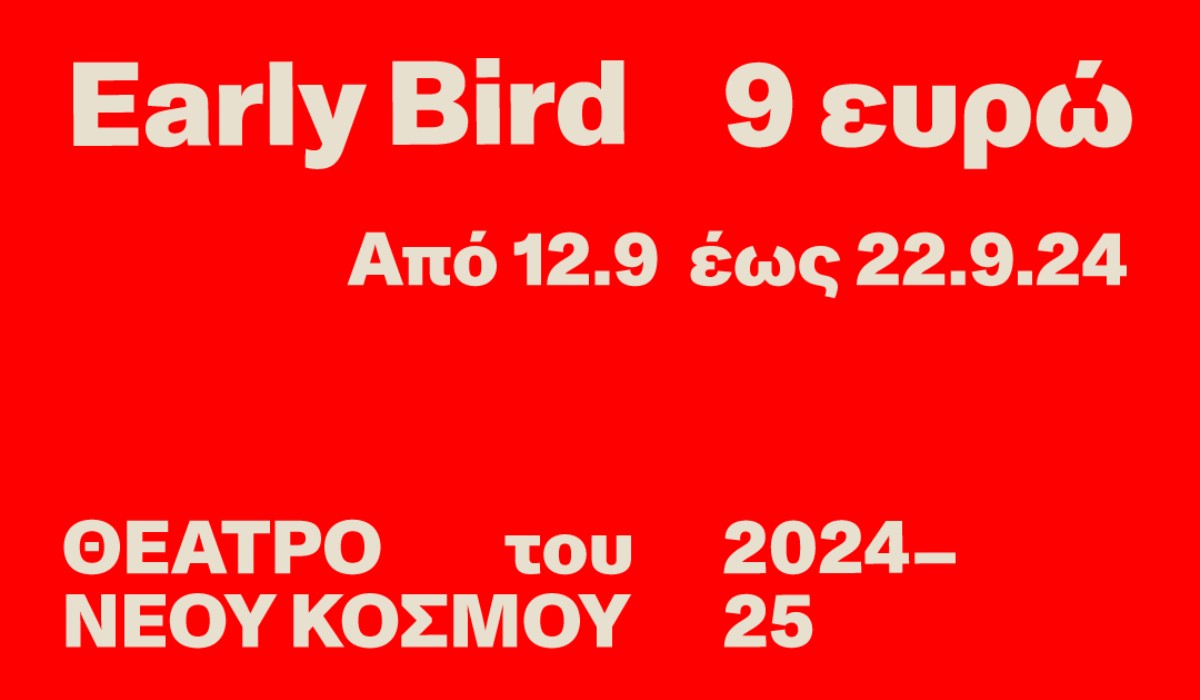 Το Θέατρο του Νέου Κόσμου, στο πνεύμα που απαιτεί η εποχή μας, προσφέρει για άλλη μια χρονιά στο κοινό του την ευκαιρία να προμηθευτεί εισιτήρια για όλες τις παραστάσεις του στην τιμή των 9€! Η προσφορά ισχύει για τις αγορές εισιτηρίων που θα γίνουν στο διάστημα 12-22 Σεπτεμβρίου. Δείτε το πρόγραμμα παραστάσεων και προμηθευτείτε έγκαιρα τα εισιτήριά σας στο www.nkt.gr και more.com