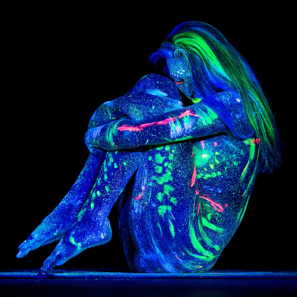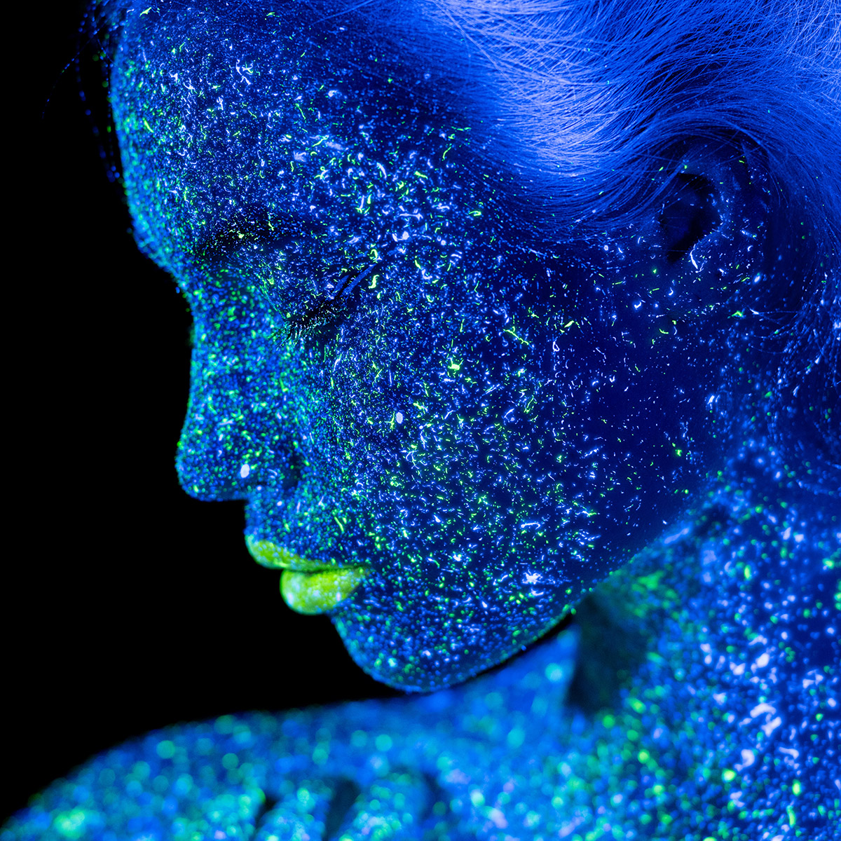 Κεντρική φωτογραφία θέματος: Portrait of a woman (doudou_aiikili) with blue UV bodypaint