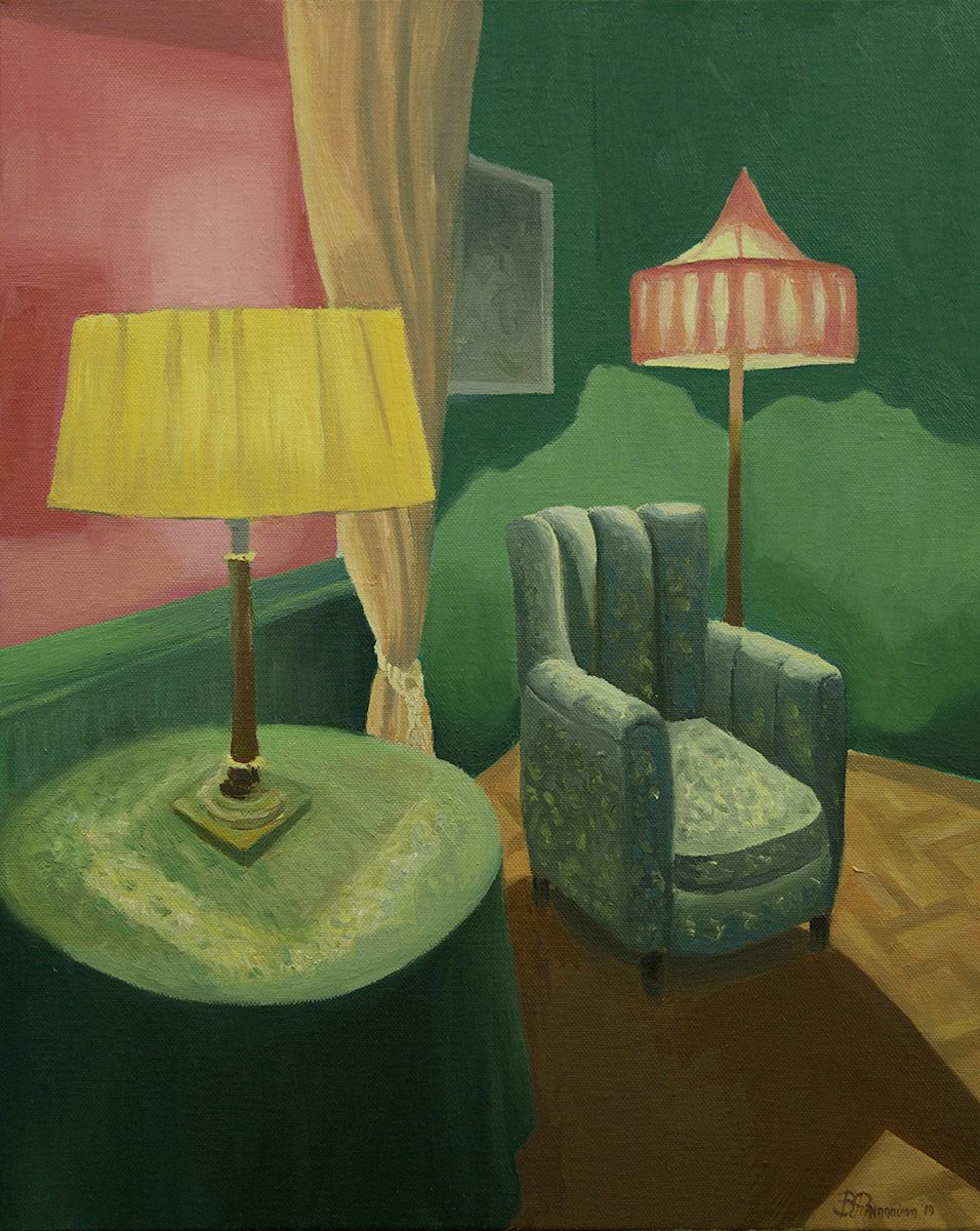 Η ατομική έκθεση της Βιργινίας Φιλιππούση «Το Πράσινο δωμάτιο», σχεδιάστηκε ειδικά για την Οικία Άγγελου & Λητώς Κατακουζηνού και αποτελεί ένα γοητευτικό εικαστικό αφήγημα περιήγησης ανάμεσα στους λαμπερούς οικοδεσπότες, τους στενούς φίλους και τους οικείους τους, ανάμεσα στα πνευματικά και τα υλικά κειμήλια, τις μνήμες και τις ιστορίες της οικίας. Που είναι ταυτοχρόνως οι άνθρωποι, οι μνήμες και τα κειμήλια της αξέχαστης γενιάς του ’30 που κατοίκησε και λάμπρυνε με την παρουσία της τα γαλάζια σαλόνια και τις ιδιωτικές πράσινες κάμαρες του μοναδικού αυτού αθηναϊκού αστικού διαμερίσματος της λεωφόρου Αμαλίας.