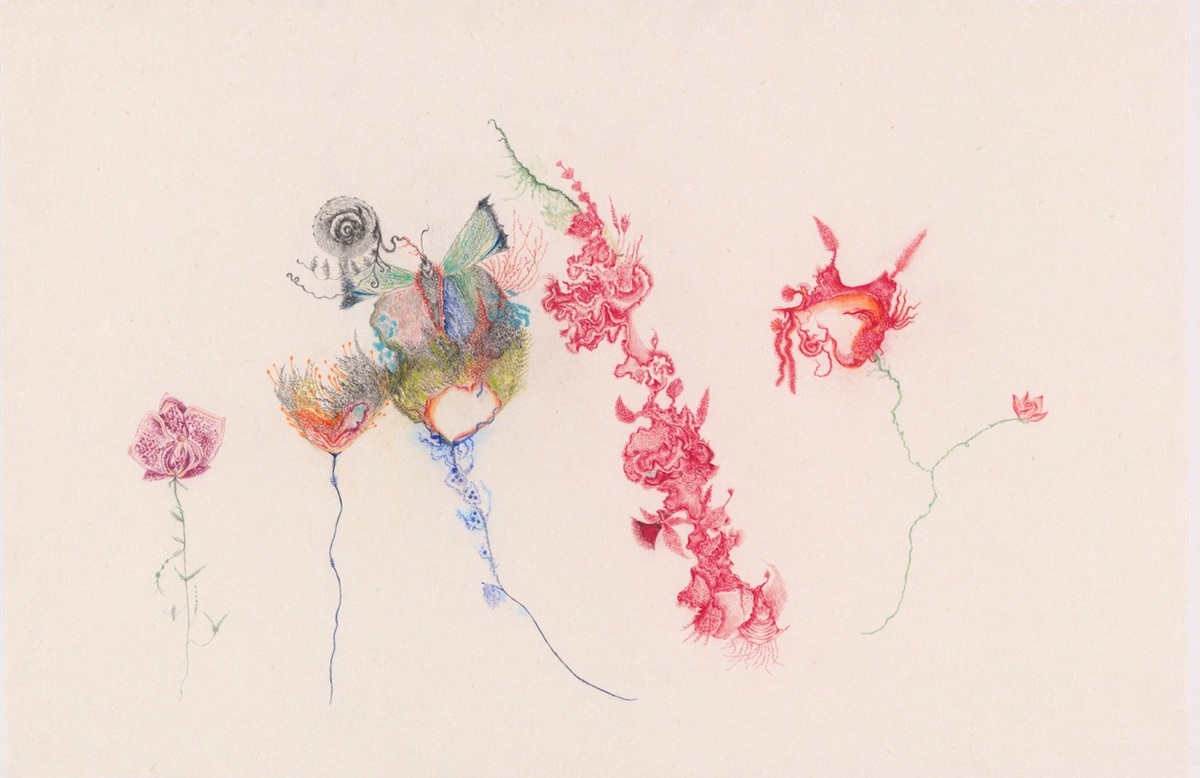 Aυτές οι διακριτικά σουρεαλιστικές εικόνες, παραπέμπουν στη θάλασσα, στα όνειρα και στη μήτρα ως χώρους συνεχούς μετασχηματισμού. Καθρέφτες, βουνά και υβριδικά πλάσματα που παραπέμπουν σε φυτά, ψάρια, γάτες και πεταλούδες επαναλαμβάνονται και εξελίσσονται σε οργανικές, διαειδικές μορφές. Μέσα από αυτήν τη βιομορφική γλώσσα, τα σώματα γίνονται ρευστά και ασταθή, αιωρούμενα ανάμεσα στο ζώο και στο τοπίο, χαρτογραφώντας διαδικασίες ανάπτυξης και μεταμόρφωσης.