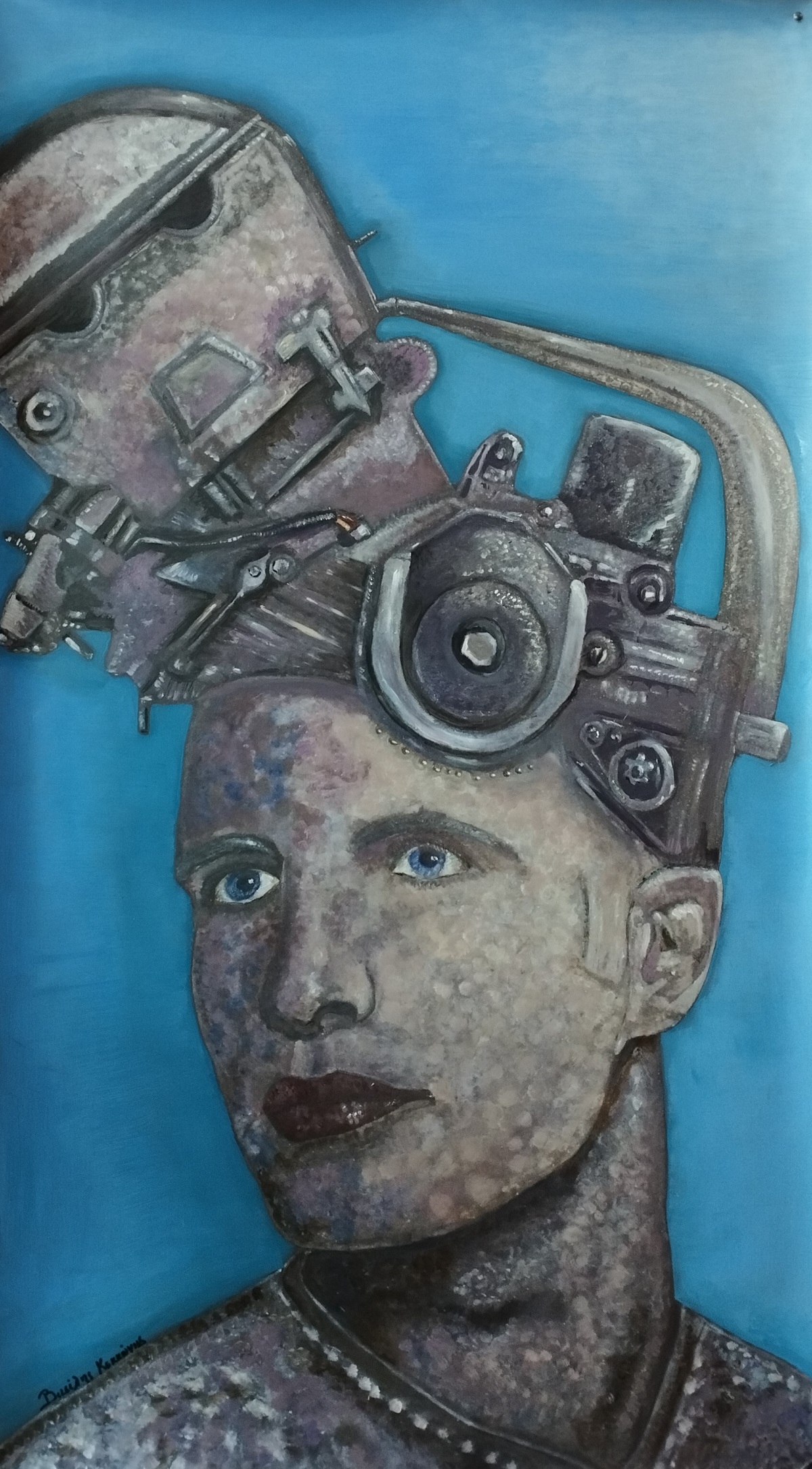 Προβάλλει σε ένα εξωπραγματικό γαλάζιο φόντο, το αψεγάδιαστα όμορφο, ρεαλιστικά διατυπωμένο κεφάλι της «Μηχανικής Σκέψης», βαμμένο γκρίζο σαν το μοτέρ που τοποθετεί στην κορυφή του με τα ασύμμετρα μάτια του να κοιτούν απλανή μέσα στην αμηχανία τους.