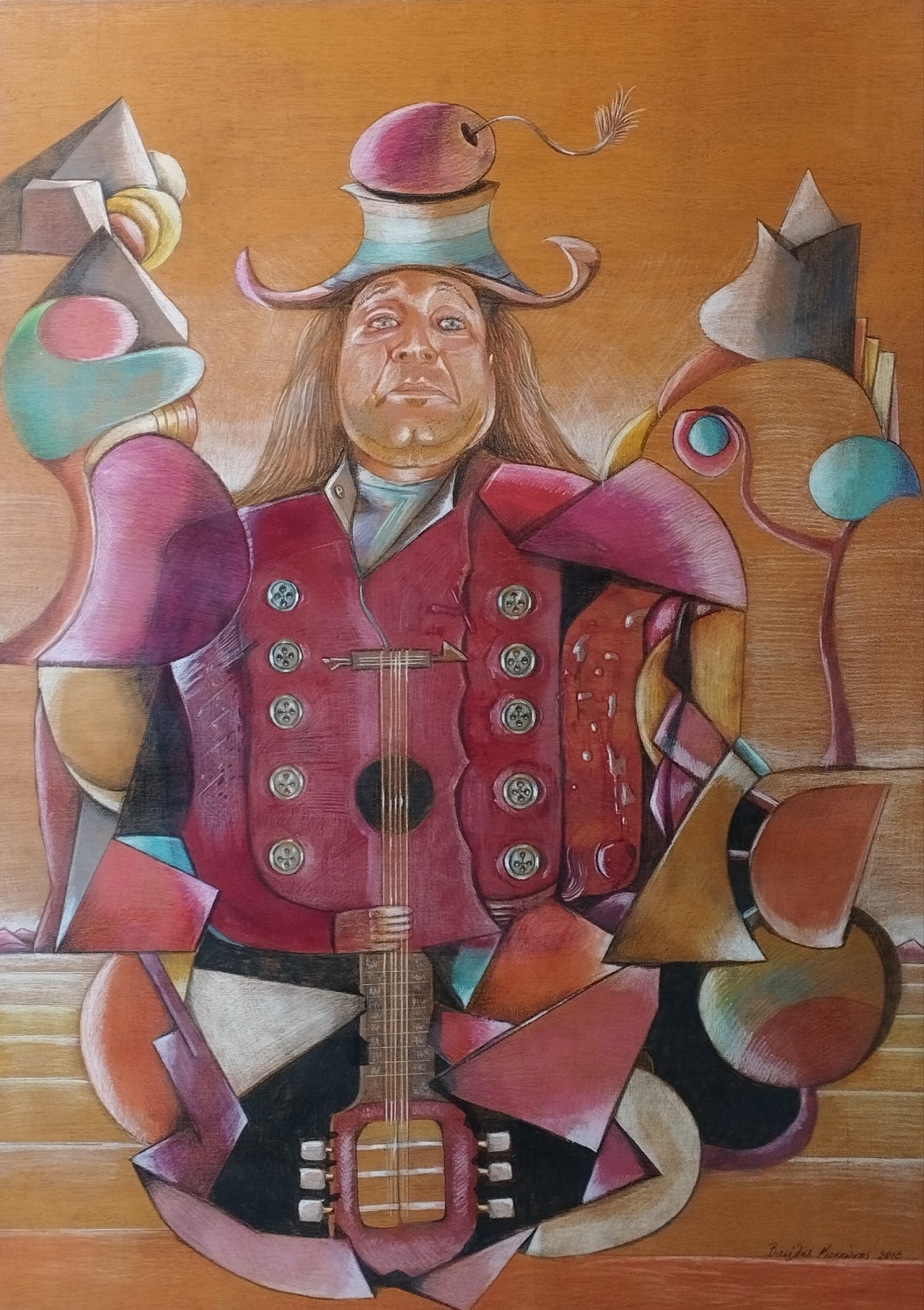 Βυθίζει τη μορφή του γελωτοποιού με το χαρακτηριστικό καπέλο «Ανθρώπου κιθάρα» σε ένα σύμπαν από σχηματοποιημένα πλάσματα όπου κυριαρχούν οι ροζ, μαβιές και γαλάζιες τονικότητες και έρχονται σε ευθεία αντίθεση με το αυστηρά σχεδιασμένο, μεταλλαγμένο στο έγχορδο όργανό του σώμα και με τη θλιμμένη έκφραση του προσώπου του.