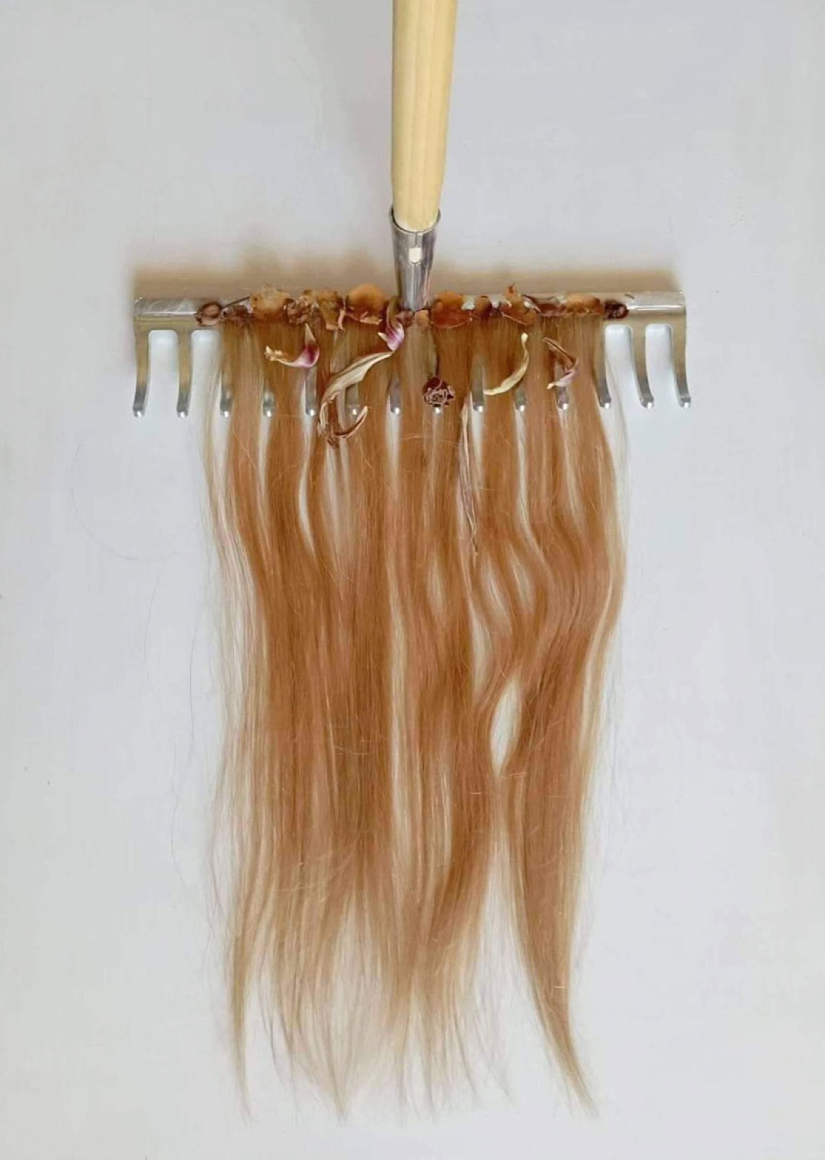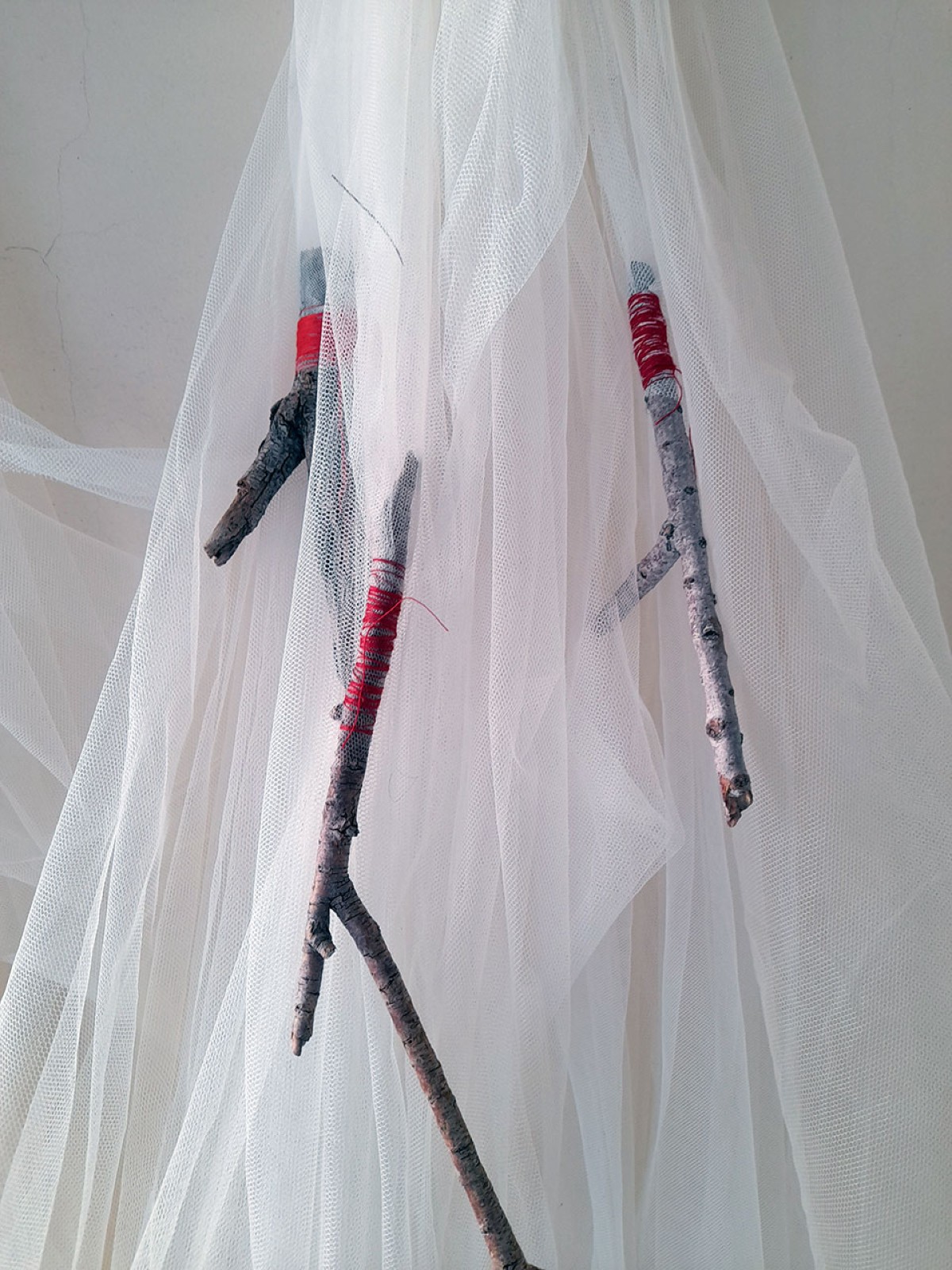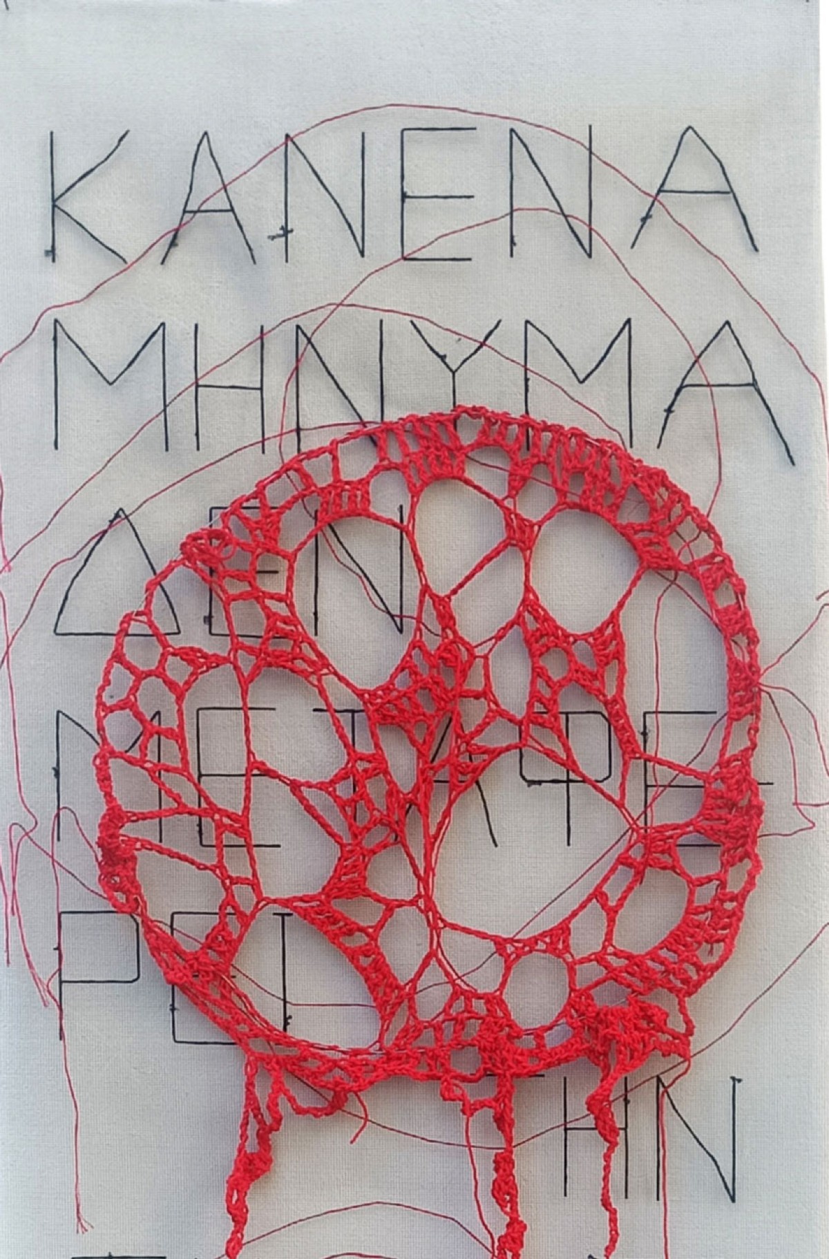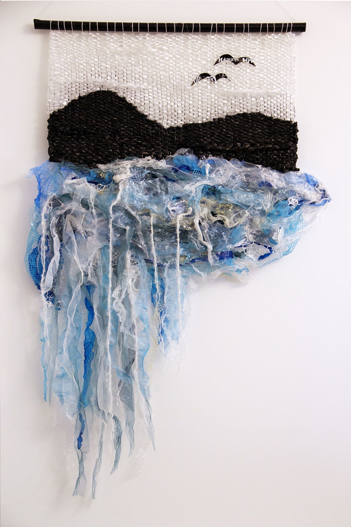 Η Ευδοκία Κύρκου εκφράζει την αναγκαιότητα να εγγραφούν «ιστορίες» εκ νέου στο λευκό χειροποίητο χαρτί, συνυφασμένες με τις νέες εξελίξεις σε συνδυασμό με την πολιτιστική παράδοση (χρήση της κλωστής). Η κλωστή χρησιμοποιείται ως ένα είδος γραφής, που ξετυλίγεται ανεμπόδιστα, που άλλοτε δημιουργεί κόμπους κι άλλοτε λύνει. Το έργο “Breath”, της Κυριακής Μαυρογεώργη, μοιάζει με τις μινιατούρες που στόλιζαν τα σαλόνια, όπου μέσα από την ευθραυστότητα του υλικού και του μεγέθους, μας υπενθυμίζει την σπουδαιότητα της χειρωναξίας, μέσα από το βελονάκι ως διαδικασία διαλογιστική και ως αναπνοή για τις γυναίκες που ήταν εγκλωβισμένες στις κοινωνικές συμβάσεις. Η Λαμπρινή Μποβιάτσου επηρεασμένη από την μετάλλαξη των σχέσεων των φύλλων, την ενδοοικογενειακή βία, την έμφυλη βία και τις γυναικοκτονίες, δημιουργεί ένα μετα-ξόανο, ένα μετα-τοτέμ- τσουγκράνα που από κηπουρικό εργαλείο, μετατρέπεται σε εργαλείο θανάτου αφού στα δόντια της είναι σκαλωμένα γυναικεία μαλλιά, ενώ προσθέτει τ’ άνθη της μπουκαμβίλιας, ως μη και ξορκίσει το κακό (!) «Δυσοίωνο μέλλον» είναι το μέλλον της ανθρωπότητας και της γης, κατά την Βασιλική Μυλωνά, που υφαίνει με νήμα, πλαστικές σακούλες, ρετάλια, πλαστικά απορρίμματα από την παραλία, για να μας ευαισθητοποιήσει και να υπογραμμίσει ότι το σημαντικότερο υφαντό είναι η γη και είναι στο χέρι μας να την σώσουμε και να σωθούμε (!)