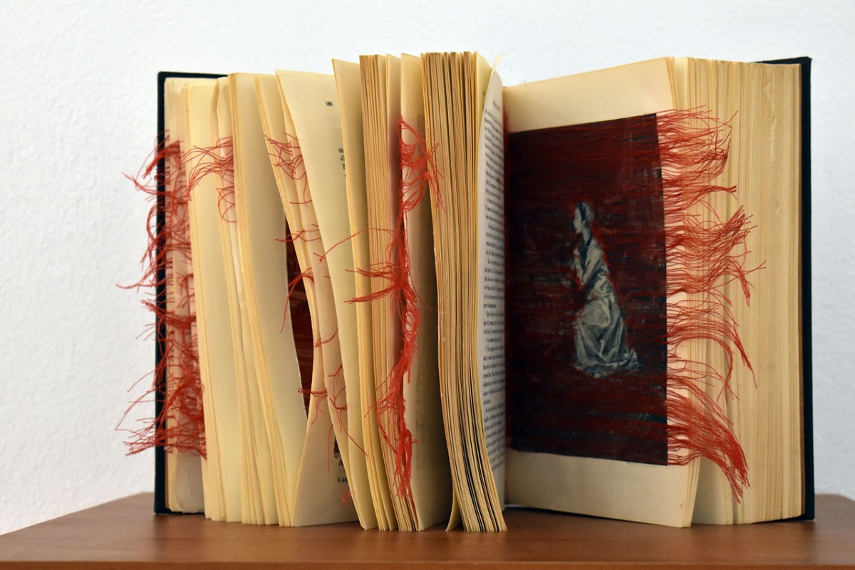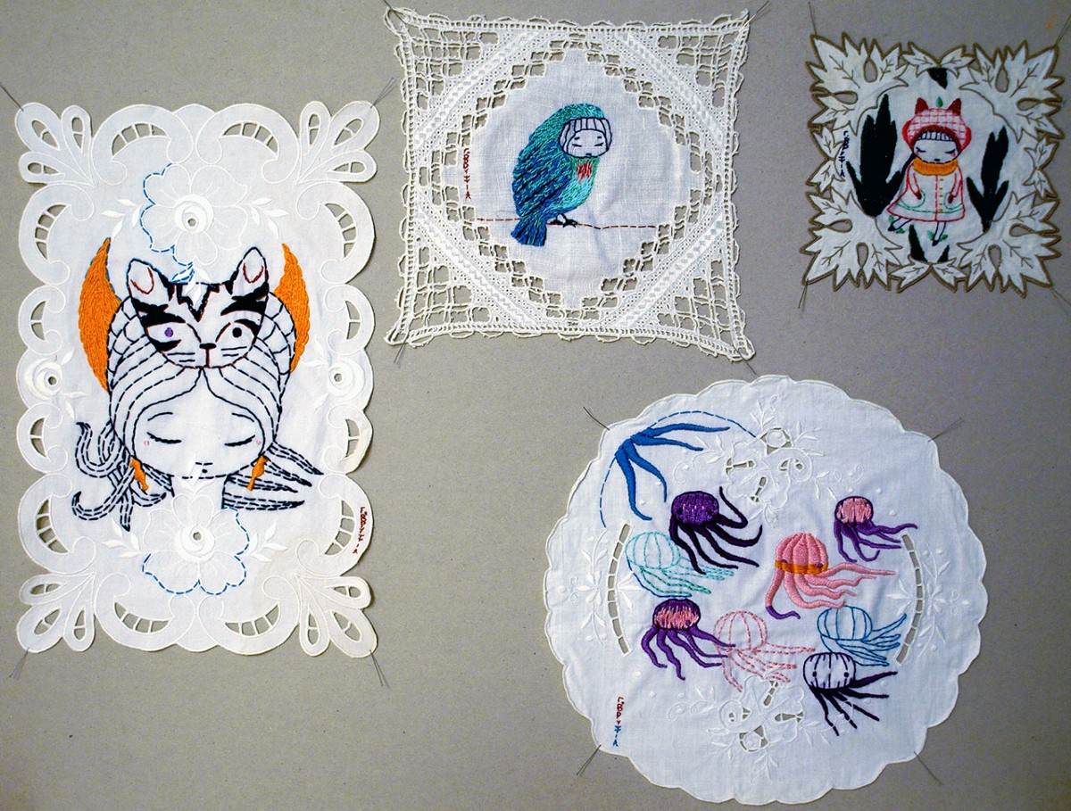Η Γρηγορία Βρυττιά μέσα από παραδοσιακά πετσετάκια, κεντημένα με κλασικά μοτίβα σε λευκό, δημιουργεί παραλληλισμούς μεταξύ υψηλής και λαϊκής τέχνης, παραδοσιακού και ποπ, επανασχεδιάζοντας μία εικόνα που προκαλεί τον θεατή να ταυτιστεί με αυτή. Η Πέννυ Γκέκα εστιάζει στη φύση και την ευαλωτότητά της, στην επιτακτική ανάγκη να την σώσουμε και να σωθούμε, κεντώντας στο χαρτί με μαύρη κλωστή στοιχεία, αποκαΐδια ενός πολιτισμού που αγωνιά ν’ αναγεννηθεί από τις στάχτες του. Μία μάσκα που κρύβει την ερωτική επιθυμία, κεντάει η Ανδρομάχη Γιαννοπούλου. Κεντάει και γελάει με τον καρχαρία που έρχεται να επιθεωρήσει αν επέτρεψε να φανούν τα κεράσια. Γελάει και αυτοσαρκάζεται γιατί ξέρει ότι ο καρχαρίας μπορεί να είναι και η ίδια χωρίς να το θέλει, σ’ ένα παιχνίδι αυτοελέγχου, θύτη και θύματος.