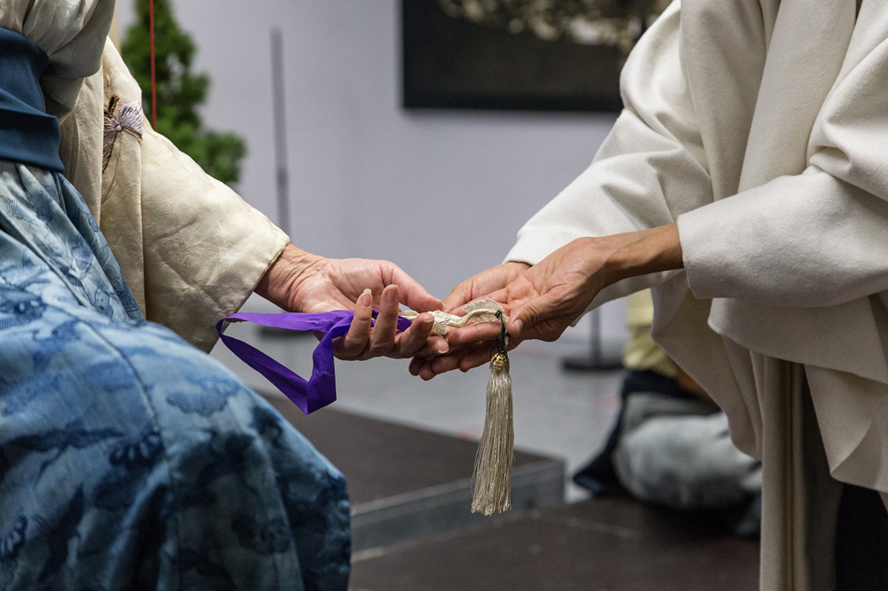 Ο Μιχαήλ Μαρμαρινός, μετά την εξαιρετική Νέκυια που παρουσιάστηκε στην Επίδαυρο με ηθοποιούς του θεάτρου Νο (βραβείο καλύτερης παράστασης αρχαίου δράματος 2015), επανέρχεται στο είδος, αυτή τη φορά από την αντίθετη κατεύθυνση. Έτσι, επιλέγει να ανεβάσει με Έλληνες ηθοποιούς, ένα έργο της παράδοσης του Νο, σε μια παράσταση που, αν και διατηρεί απολύτως τη δομή, τους σκηνικούς συμβολισμούς και τη βασική αισθητική μιας παράστασης Νο, δεν έχει σκοπό να μιμηθεί το είδος, κρατώντας προσωπικές αποστάσεις. Ο σκηνικός χώρος είναι λιτός, όπως ορίζεται από τις αρχές αυτού του θεάτρου, ενώ τα κοστούμια έχουν ιδιαίτερη σημασία.