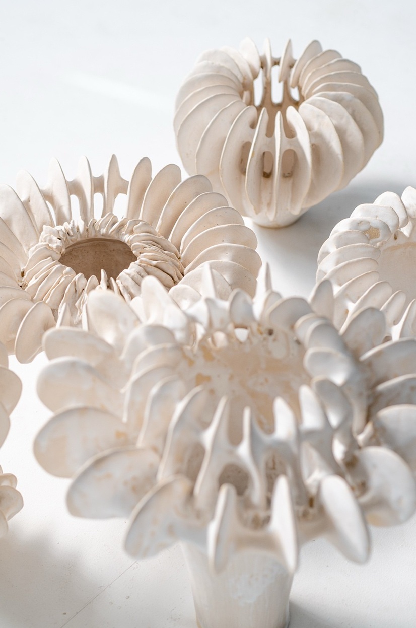 Αντλώντας έµπνευση από οργανικές µορφές της φύσης (θαλάσσιους οργανισµούς, άνθη, οστά και πέτρες) η πρακτική της Κάλλιας Πανοπούλου, επικεντρώνεται στη γλυπτική διάσταση της κεραµικής, στην ανάδειξη των ατελειών ως στοιχείο αισθητικής και στη δηµιουργία επιφανειών που παραπέµπουν σε φυσικές διαβρώσεις και απολιθώµατα. Μέσα από πειραµατισµούς µε διαφορετικές θερµοκρασίες όπτησης και επεξεργασίες επιφανειών, αναδεικνύει τον διάλογο ανάµεσα στην ευθραυστότητα και την ανθεκτικότητα του υλικού, µετατρέποντας τον πηλό σε φορέα οργανικής µνήµης και υλικότητας.